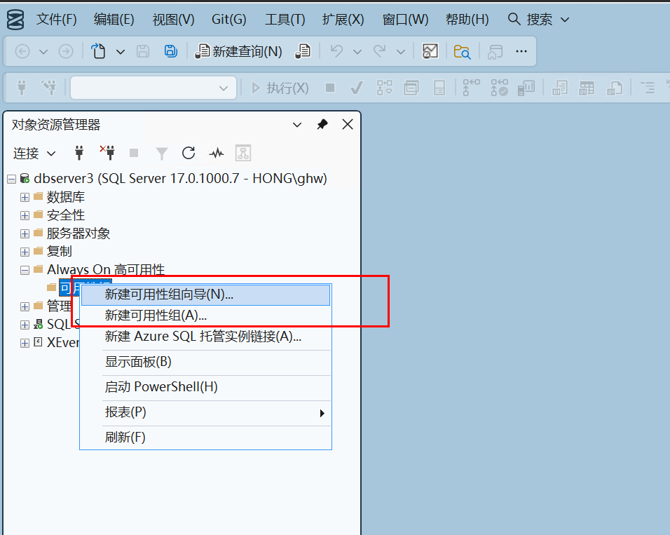 回到主节点上,使用域管理员账户登录,并打开SSMS工具连接数据库。在左侧的菜单里展开菜单: