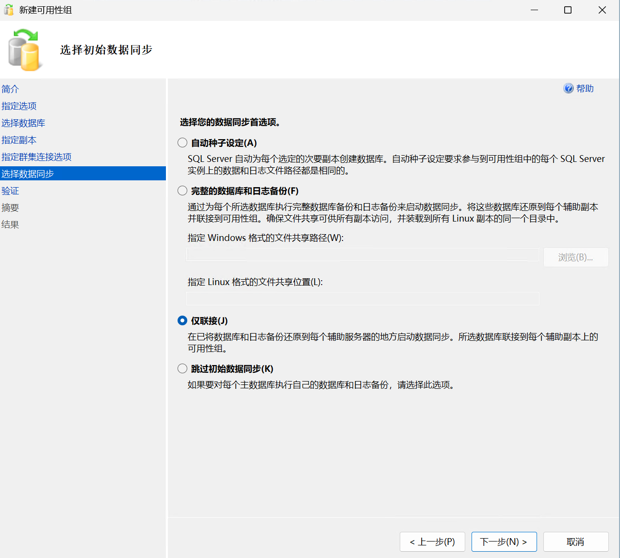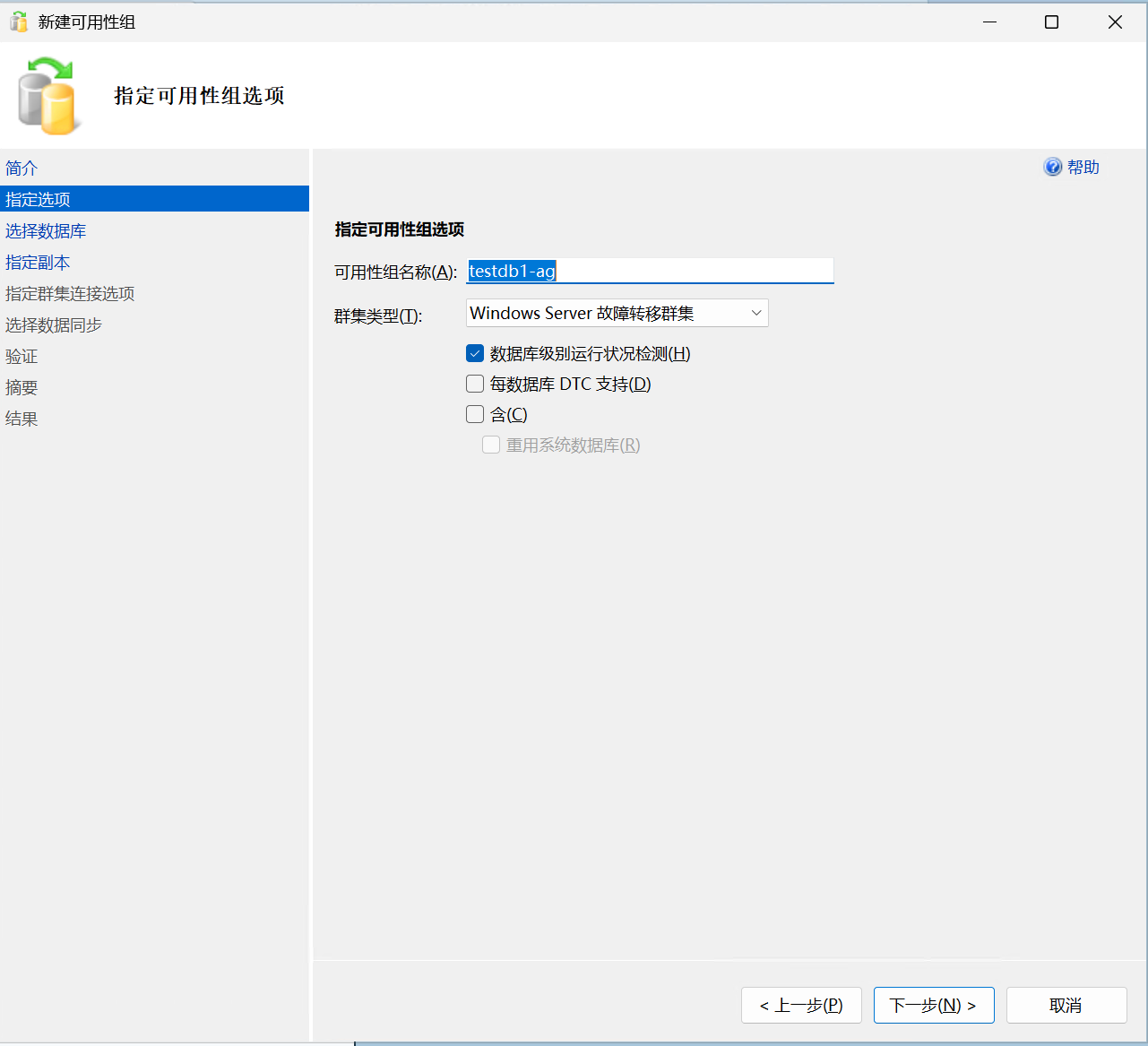 在向导对话框里给可用性组取一个名字,另外需要注意如下的几个选项: