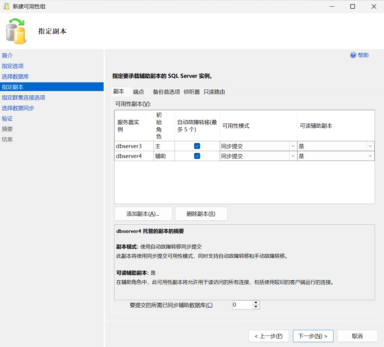继续下一步之后,添加必要的副本节点: