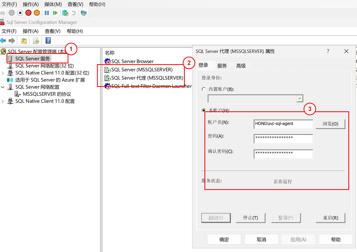 要记得两个账户分别对应SQL Server和SQL Agent