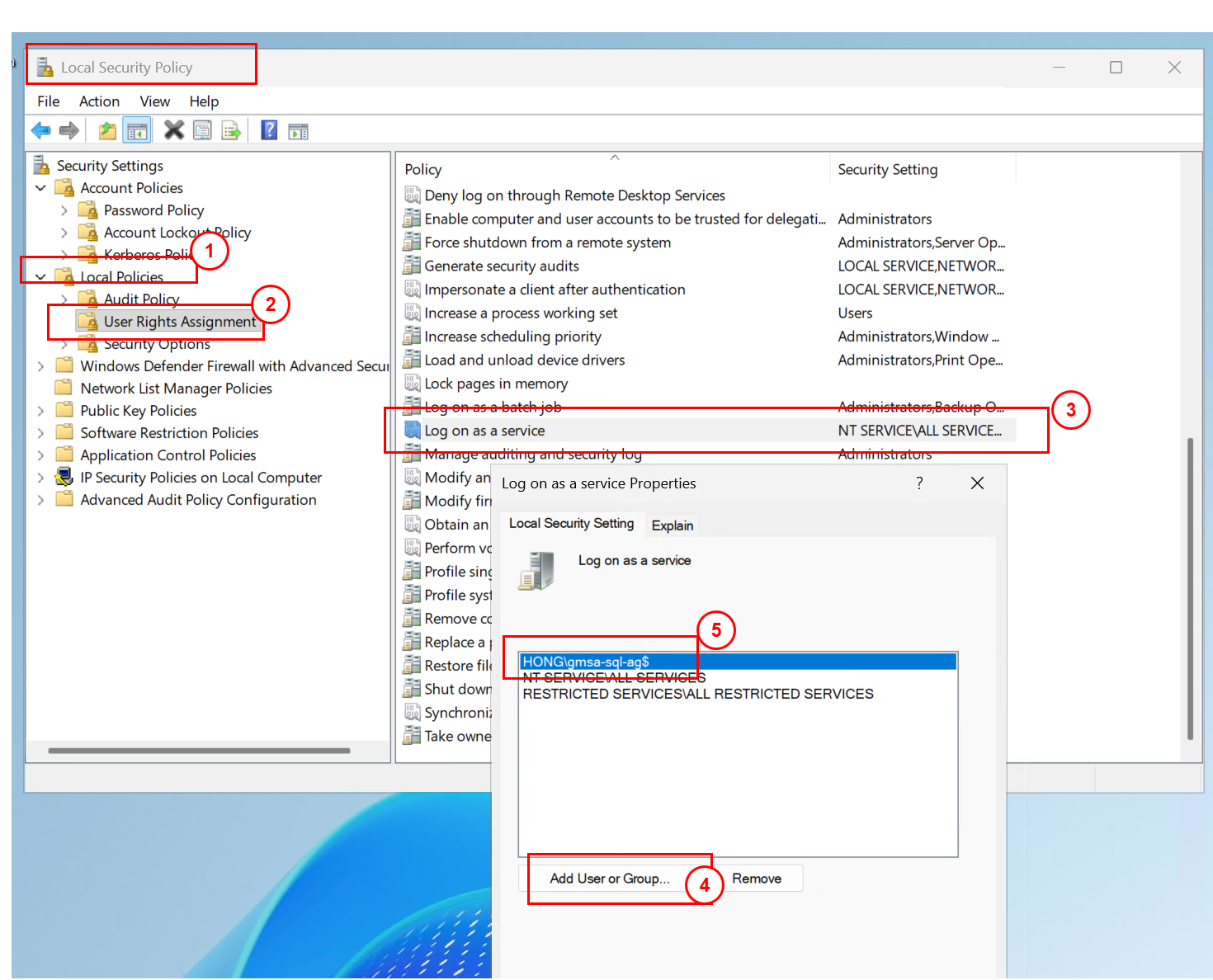 启动本地策略编辑器 secpol.msc, 按照下图添加gMSA, 注意它的账号格式: HONG\gmsa-sql-ag$, 这个账号后面必须要额外添加一个$